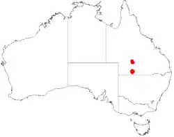 This species of Acacia has only been found in southern inland Queensland, from near Adavale and near Thargomindah on the slopes of red sand dunes and on alluvial soils in open shrubland.[2][3]