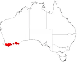 Two-flowered acacia is native to the Avon Wheatbelt, Esperance Plains, Jarrah Forest, Mallee bioregions of south-western Western Australia where it grows in sandy to gravelly lateritic soils.[8] The shrub is found in a large continuous distribution from the Stirling Range National Park south to the coast and then east to near Jerramungup and Bremer Bay with disjunct populations in several areas further east including around Scaddan and at Lucky Bay in Cape Le Grand National Park.[4] It is often found as part of woodlands or low mallee scrubland communities.[4]