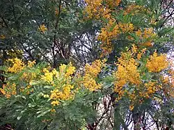 The flowers are borne in axils or on the ends of branches in panicles of spherical heads on peduncles 3–5 mm (0.12–0.20 in) long, each head 5–9 mm (0.20–0.35 in) in diameter with 12 to 30 bright yellow to golden-yellow flowers. Flowering occurs in spring between September and October and the pods are straight or slightly curved, brown, bluish or purplish brown, 40–115 mm (1.6–4.5 in) long and 7–11 mm (0.28–0.43 in) wide and are fully developed between November and December.[3][5][6][7]