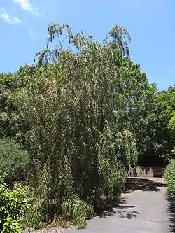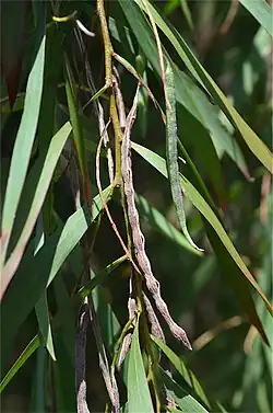Acacia courtii is a tall shrub or spreading, weeping tree that typically grows to a height of 7–20 m (23–66 ft) and has slender, brittle and pendulous branchlets and foliage. The bark is smooth and grey on young plants, later black and furrowed. Its phyllodes are very narrowly elliptic, usually straight, 90–180 mm (3.5–7.1 in) long and mostly 5–10 mm (0.20–0.39 in) wide, hooked and flexible, mostly glaucous with usually a single prominent vein. There are stipules less than 0.5 mm (0.020 in) long at the base of the phyllode but fall off as the phyllodes mature. The flowers are pale yellow or cream-coloured and are borne in a single or paired spikes 30–65 mm (1.2–2.6 in) long on a peduncle 3–5 mm (0.12–0.20 in) long. Flowering occurs between November and January, and the pods are linear, straight to slightly curved, 110 mm (4.3 in) long and 3–5 mm (0.12–0.20 in) wide, leathery, raised over and slightly constricted between the seeds. The seeds are shiny brown 5.5–7.8 mm (0.22–0.31 in) long with a small aril.[3][4][5][6][7]