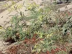 The shrub or tree has a spreading to erect habit and typically grows to height of 1.5 to 7 m (4 ft 11 in to 23 ft 0 in) and has smooth grey-brown to green coloured bark. It has angled to terete ridged branchlets with tiny yellow to whitish hairs. The pinnate leaves have ten to twelve pairs of pinnae that are 0.7 to 6.5 cm (0.3 to 3 in) in length with 7 to 45 pairs of pinnules that have an oblong to linear shape and have a length of 1.5 to 12 mm (0.06 to 0.5 in) and a width of 0.4 to 1.3 mm (0.02 to 0.05 in). It blooms throughout the year producing inflorescences situated in the terminal and axillary racemes and panicles. The spherical flower heads have a diameter of 3 to 5.5 mm (0.12 to 0.22 in) and contain 15 to 30 cream-coloured to pale yellow or occasionally yellow flowers. The seed pods that form after flowering are flat and straight to curved and constricted between seeds. The leathery pods are 3.5 to 18 cm (1.4 to 7.1 in) in length and 5.5 to 11 mm (0.2 to 0.4 in) in width.[1]