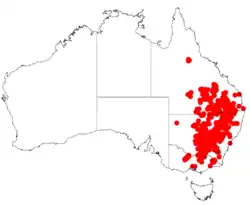The plant is endemic to eastern Australia through Queensland, New South Wales and Victoria. It is found in a variety of habitats often as a part of sclerophyll forest communities and growing in a range of different soil types.[1] It is common throughout inland parts of southern Queensland, and central parts of both New South Wales and Victoria.[3]