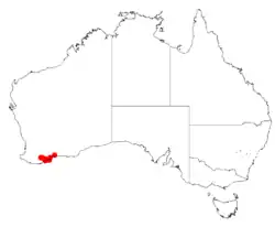 It is found in the Great Southern region of Western Australia between Albany in the west, Gnowangerup in the north and Ravensthorpe in the east where it is often situated along riverbanks and on gentle slopes growing in loamy soils.[2] The bulk of the population is found in the catchment area of the Pallinup and Fitzgerald Rivers.[3]