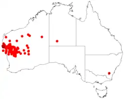 It is native throughout the arid interior of Western Australia, with isolated populations in South Australia and the Northern Territory.[3] In Western Australia it has a scattered throughout the Mid West, northern Wheatbelt and Gascoyne regions as well as smaller populations in the Pilbara and northern Goldfields regions where it is often situated on rocky rises and hills, stony or clay flats as well as undulating sandplains where it grows in sandy red lateritic soils[1] often as a part of Acacia scrubland communities.[3]
