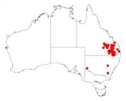 It is native to an area to southern Queensland extending into northern New South Wales, particularly in the Yetman district close to the border of Queensland on the north west slopes of New South Wales. Although reasonably rare in New south Wales it is quite common in Queensland. It is mostly located in dry Eucalyptus sclerophyll woodland communities growing in sandy to sandy-loam soils sandy to sandy-loam soils or among dry ranges in clay-loam to loamy soils.[1]