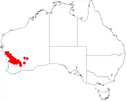 It is native to an area in the Mid West, Goldfields and Wheatbelt regions of Western Australia where it grows in sandy soils around laterite.[1] It is found as far north as around Yuna south to around Goomalling and east out to Mount Holland where it is found in scrubland or open woodland communities.[2]