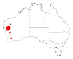 It is native to Pilbara, Gascoyne and Mid West regions of Western Australia where it is known to grow in quartzite, and granitic soils and is often found along watercourses and swampy areas.[2] It has a discontinuous distribution and is found from around Pingandy Station along the Ashburton River in the north down to around Murgoo Station and the Murchison River in the south where it is often situated on loamy alluvial plains as a part of shrubland communities where it is usually associated with Acacia aneura.[1]