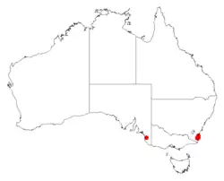 It is endemic to New South Wales from around the Bermagui in the north down to near Tahra in the south where it is found on headlands or behind sand dunes growing in sandy or clay loam soils as a part of open Eucalyptus forest communities.[1]