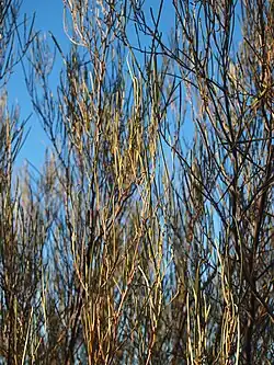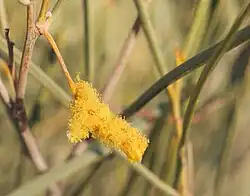 A. ramulosa is an erect, spreading and multi-branched shrub that typically grows to a height of 1.5 to 6 metres (5 to 20 ft).[1] The ribbed glabrescent branchlets have small white hairs between the ribs, the resinous young tips are darker in colour. The phyllode bases can have resinous ribs with some red-glandular hairs. The erect, thick and linear phyllodes are usually 7 to 15 centimetres (3 to 6 in) in length and 5.5 to 7 millimetres (0.217 to 0.276 in) in width. The phyllodes are striate with thick longitudinal nerves.[4] It blooms irregularly throughout the year producing yellow flowers,[1] flowers usually appear in cooler weather often after rainfall events.[5] The simple inflorescences usually appear singly in the axils. The dense golden flower-spikes are 5 to 30 mm (0.20 to 1.18 in) in length. The straight cylindrical seed pods that form following flowering are tapered at each end are up to 13.5 cm (5 in) in length with a diameter of 8 to 10 mm (0.31 to 0.39 in). The pods hang downwards from the branchlets usually in groups resembling a horse's tail. The pods are grey in colour and have longitudinal brown stripes.[5] The creamy coloured seeds within the pod have an oblong shape and are 6 to 12 mm (0.24 to 0.47 in) long and 4 to 9 mm (0.16 to 0.35 in).[4]