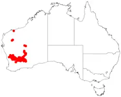Acacia resinimarginea is native to a large area in the Mid West and Wheatbelt region of Western Australia where it is often situated on undulating plains growing mostly in sandy[1] but sometimes in loamy soils, often as pure stands. It is found from around Perenjori in the west to around Kambalda in the south east and up to around Leonora in the north.[2]