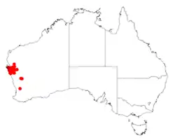 It is native to an area in the Mid West, Gascoyne and Wheatbelt regions of Western Australia where it is commonly situated on sandplains growing in sandy or sandy–loam soils.[1] The range of the plant extends from Ajana in the south to around Towrana Station in the north to the south of Gascoyne Junction where it is commonly a part of closed Acacia scrubland communities.[2]