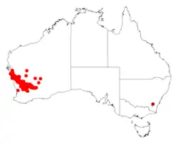 It is native to a large area in the Mid West and Wheatbelt region of Western Australia.[1] The bulk of the population of found from around Kalbarri National Park in the north west down to around Tammin in the south east and to around Boorabbin in the east.