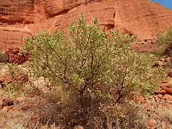 It is native to arid desert areas in the north western South Australia, southern Northern Territory[3] and the north eastern Goldfields region of Western Australia.[2] It is found along watercourses,[4] on rocky hillsides and valley floors and walls growing in shallow red sandy soils.[3] It is usually a part of tall shrubland communities with other Acacia and Eucalyptus species.[4]