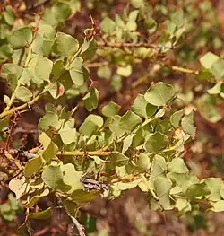 The erect, glabrous, spinescent and straggly shrub typically grows to a height of 1 to 3 metres (3 to 10 ft).[2] The yellowish-green to reddish-brown branchlets are slightly flattened and have smooth thin brown coloured bark.[3] The evergreen flat dull phyllodes have a rhomboid-orbicular shape and are up to 2 centimetres (0.8 in) in length and width and have one prominent major vein.[3] It blooms between June and October forming yellow flowers.[2] The simple axillary flower-spikes are usually solitary or occur in pairs and have large spherical deep golden-yellow flower-heads. Following flowering brown seed pods form that have an oblong shape and are around 8 cm (3 in) in length and 12 millimetres (0.472 in) wide. The pods are flat but raised over each seed.[3] The hard shiny black-brown[4] seeds have an ovoid shape and are about 5 mm (0.197 in) with a width of around 3.5 mm (0.138 in).[3]