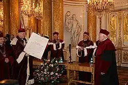 Academic dress may be completed by a chain of office (for the presiding Rector or Dean) or the insignia of honorary doctorates or royal orders (only worn at the dies natalis).