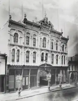 The Academy of Music was designed by architect Stephen Vaughn Shipman (1825–1905).[8] The building stood 60 feet high and was 120 feet long and 52 feet wide, and the stage was 25 ft by 35 ft. It was built by Bushnell & Co.[6] The theatre had a seating capacity of 1200 people.[10] Its inaugural performance occurred on January 10, 1872. It opened with a production of T. W. Robertson's comedy Ours with a cast led by the actor Charles Wyndham.[8]