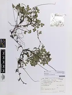 This is a low plant distinctive for its prostrate branches each ending in three bluish-green leaflets. The margins of these leaflets are minutely toothed, the teeth often being reddish brown. It often grows as a ground cover plant beneath thickets of Matagouri (Discaria toumatou). Flowering occurs in November and December with fruit being produced in January.