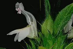 The inflorescence includes bracts armed with centimeter-long spines and glandular, hairy white to pink-tinted flowers up to 2.5 centimeters long. Each flower has lobed, hooded upper and lower lips forming a deep cup.
