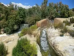 The Spanish word acequia (and the Catalan word séquia) originate from Arabic word al-sāqiyah (الساقیة)[2] which has more than one meaning: "the water conduit" or "one that bears water" as well as 'bartender' (from سَقَى saqā, "to give water, drink"), and also refers to a type of water wheel.