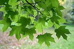 It is a small to medium-sized deciduous tree growing to 10–20 m tall, with a trunk 30–40 cm diameter with rough, grey-brown bark. The leaves are five-lobed (the basal pair of lobes usually small), 7–20 cm long and 12–20 cm broad, with a 5–15 cm long petiole; the petiole bleeds white latex if cut. The flowers are produced in spring at the same time as the leaves open, yellow-green, in erect corymbs. The fruit is a samara with two winged seeds aligned at 180°, each seed 8 mm wide, flat, with a 2 cm wing.[2][3]