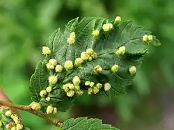 The mites pass the winter hidden in bark crevices and in the spring attack the leaves. The gall is a small pimple or pouch, 1–2 mm across, on the blade or the veins. They are rounded above and have a hairy opening below, with or without a conical projection. Galls are greenish-yellow and redden when exposed to sun, they can be numerous and contain mites.[2][3]