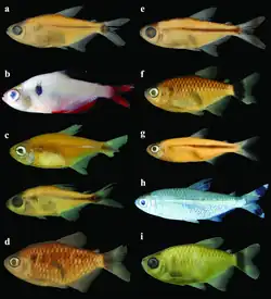 Acestrorhamphidae, the American tetras, are a diverse family of freshwater fish in the order Characiformes. They are native to North and South America, from the southwestern United States south to temperate Argentina, with a few species introduced to other parts of the world. It includes many genera previously placed in the family Characidae, which was split into multiple families in 2024. It contains many of the most famous ornamental aquarium fish that are popularly known as tetras.[1][2][3]
