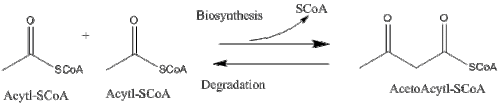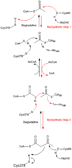 The formation of a carbon–carbon bond is a key step in the biosynthetic pathways by which fatty acids and polyketide are made. The thiolase superfamily enzymes catalyse the carbon–carbon-bond formation via a thioester-dependent Claisen condensation[2] reaction mechanism.[3]
