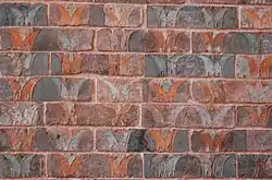 Intricate scenes depicting archers of king Darius would decorate the walls, as well as motifs of nature such as double-bulls, unicorns, fasciae curling into volutes, and palms disposed as a flower or a bell. The archers in particular depict a unique symbiosis of Persian, Ionian and Greek artistry of the time probably reflecting the origin of the artists who were originally hired by Darius the Great, and their personal reflections on the finished work.[30] Perhaps the most striking terra-cotta relief is that of the griffin, depicting a winged creature resembling a lion with wings of an eagle (picture not shown here). The terra-cotta brick reliefs were decorated with lively dye colorations often giving them a lifelike quality.