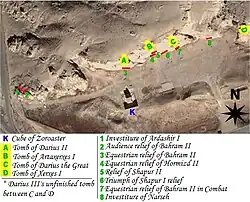 Naqsh-e Rustam is an archaeological site located about 6 kilometers to the northwest of Persepolis in Marvdasht region in the Fars province of Iran.[34] Nash-e Rustam acts as a necropolis for the Achaemenid kings, but is a significant historical entity in that it also housed ancient Elamite relief, as well as later relief by the Sassanid kings. Naqsh-e Rustam is not the actual name of this massive structure, but is the New Persian compound word composed of "Naqsh" meaning "face", or "facade", and "Rustam" referring to the hero of the Persian epic Shahnameh. The Elamites, Achaemenids, and the Sassanids lived centuries before the drafting of the Shahnameh by the Persian poet Ferdowsi, and therefore the name is a misnomer, the result of the great amnesia of Persians about their ancient past, that settled over them after being conquered by the Arabs.[35]
