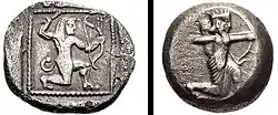 The "archer" type used in Achaemenid coinage may have been derived from similar and contemporary images on Greek coinage, in particular those of Herakles shooting arrows.[31][32] The adaptation of this design for the illustration of the Achaemenid king or hero on the obverse may have been meant as a way to glorify the king, in way a which was easily understandable to the Hellenized people in the Western areas of the Achaemenid Empire, who minted the Achaemenid coinage and to whom this coinage was mainly destined as a currency.[31][32] Other depictions of the king as an archer (for example shooting from his charriot) are also known from Sumerian art, so this representation would also have been natural to subjects in the Achaemenid realm as well.[31][32] The "archer" type of Type II, less hieratic and rigid than the traditional Achaemenid illustration of the bust of the king on Type I, may represent the fusion of the Eastern conception of the King as a royal hunter, and the Western conception of the King as a hero, and designed to represent the Achaemenid king as an Olympian contestant in a propaganda effort towards the West.[31][32] These depictions also imply that the Achaemenids were the first ever to illustrate the person of their king on coinage.[31]