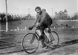 During the winter of 1905–1906, Germain trained alongside the best specialists of the day on the Vélodrome d'Hiver track in Paris. Though he could see the gap existing between him and those in the lead, Germain's persistence in training was noticed. Along with Georges Parent, he was chosen to join the coaching team of Henri Cornet, winner of the 1904 Tour de France, in a 50-kilometer tandem match[notes 1] against Karl Ingold. Cornet won by nine laps. At the same meeting, Germain made his mark as an individual in the 15-kilometer race behind motorcycles. Third behind Paul Rugère and Anton Jaeck, his offensive behavior throughout the race was praised by the spectators.[7] On February 18, he teamed up with Denmark's Axel Hansen in the American-style Twelve Hours race, in which the two competitors took turns at will. At the end of the race, fourteen teams were still classified in the same lap: victory was therefore decided over six laps between the best sprinters in each team. Hansen initially placed fourth, but the commissaries were slow to validate the results after a crash on the last lap. The race was eventually canceled.[7] On March 4, a meeting was held at the La Flèche Velodrome, bringing together several well-known riders. On his home turf, Germain took third place in the bonus race behind Charles Vanoni and Victor Thuau, before losing out to César Simar, Olympic medalist two years earlier, in the 10-kilometer race behind the bike.[8]
