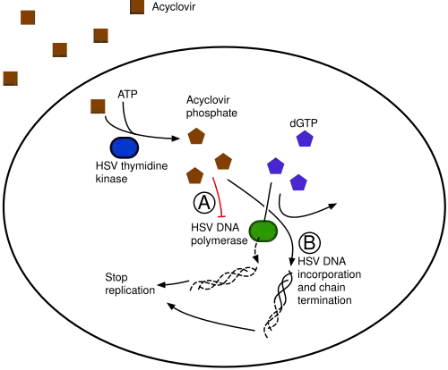 Aciclovir is converted by viral thymidine kinase to aciclovir monophosphate, which is then converted by host cell kinases to aciclovir triphosphate (ACV-TP, also known as aciclo-GTP).[27] ACV-TP is a very potent inhibitor of viral DNA replication. ACV-TP competitively inhibits and inactivates the viral DNA polymerase.[41] Its monophosphate form also incorporates into the viral DNA, resulting in chain termination.[27][42][43]