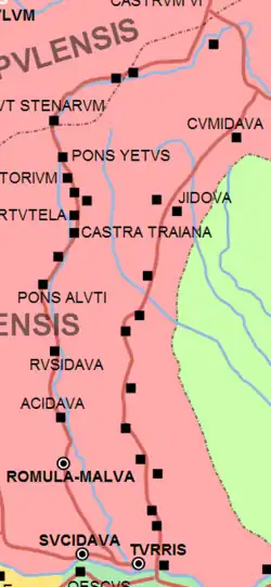 After the Roman conquest of Dacia by Roman Emperor Trajan, Acidava became a civilian and military centre, with castra being built in the area. Acidava was part of the Limes Alutanus, a line of fortifications built under emperor Hadrian running north–south along the Alutus (Olt) river.[2] The function of the limes was to monitor the Roxolani to the east and deter any possible attacks.[3]