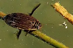 Aquatic beetles in the family Dytiscidae possess defensive glands used to secrete agents repellent and toxic to vertebrate predators.[11] Secretions primarily contain steroids synthesized from cholesterol.[12] The steroids secreted act to anesthetize predators, leading to narcosis. The steroids produced vary in levels of toxicity depending on food availability and photoperiod.[13] A. sulcatus is highly adapted for aquatic movement and can make effective use of its speed to escape threats. When tested against 72 other common water beetle species, A. sulcatus was shown to have the highest movement velocity.[14] During the day, A. sulcatus uses primarily visual information to avoid predators; however, in low-light conditions, chemical signals are used as the dominant cues for avoidance.[15]). It has also been suggested that a 'humming' sound, produced by an interaction of the wings and the elytra, is used as a defensive strategy by causing an unpleasant vibrating sensation in the mouth of a predator.[16]