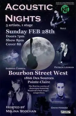 The concept of Acoustic Nights was first created by Melina Soochan.[2] The first three such events were organized in association with Artists Alliance Productions and Global NTT. Subsequent events have been organized and produced solely by Soochan. These events have had fairly good coverage in the local English media, including radio interviews on K103 and CJAD, podcasts on Midnight Poutine, and articles in newspapers like The Suburban.