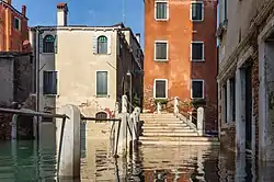 - In Friends in High Places (2000), book 9, the residence of a bureaucrat who died mysteriously has a "high step the residents no doubt hoped would raise their front hall about the level of acqua alta", and inside, "There was a small entrance, little more than a metre wide, up from which rose two steps, further evidence of the Venetians' eternal confidence that they could outwit the tides that gnawed away perpetually at the foundations of the city. The room to which the steps led was clean and neat and surprisingly well lit for an apartment located on a piano rialzato (raised ground floor[17])".[18]