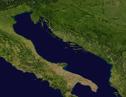 The long and narrow rectangular shape of the Adriatic Sea is the source of an oscillating water motion (called seiche) along the basin's minor axis.[5]