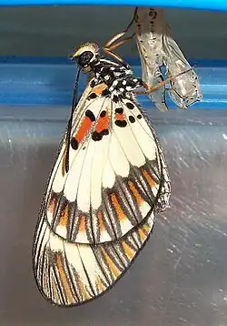 The pupae have a whitish to yellowish background with two rows of yellow and black markings down the back, but the pupa becomes dark coloured close to hatching. The wing areas have fine black veining on a whitish to yellowish background, but the black and yellow wings show through the shell of the pupa near hatching.