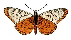 A. chilo Godm. (55 a; and 54 c, as barberi). The basal dot in 1 c and the discal dots in 2 to 4 of the forewing all four stand in a line running almost parallel with the costal margin. In this chilo and the following species [related] differ from all the rest of the subgroup. Such an arrangement of these dots is also very rare among the other African Acraeids, only occurring in niobe, hypoleuca, anacreon, mirifica and approximately also in wigginsi and neobule. male: forewing above light yellowish red, somewhat rose-coloured, at the base not or little darkened; forewing with the marginal band spotted with orange-yellow, 3 to 6 mm. broad, of uniform breadth or widened at the apex, a basal dot in 1 b, 2 in the cell, a median spot and large discal dots in 1 b to 6, of which the dot in lb is placed much nearer to the distal margin than the one in 2; hindwing above with indistinctly spotted marginal band 3 mm. in breadth and distinct discal dots, the one in 4 placed nearer to the distal margin than the rest and the one in 2 near the base of the cellule. Forewing beneath almost as above, but with whitish subapical band between discal dots 4 to 6 and the marginal band; hindwing beneath whitish yellow with some red spots in 1 a to 1 c and at the base of the costal margin and with large whitish marginal spots. In the female the forewing is hyaline with smaller black dots and larger orange-yellow marginal spots; hindwing as in the male, but more thinly scaled and lighter-coloured and also above with large, often black-dotted, yellow spots in the marginal band. Kilimandjaro; British East Africa; Somaliland and Abyssinia. -ab. crystallina Smith (54 a) is an extreme form of the female in which both wings are hyaline, only at the base slightly yellowish, and the fore wing lacks all the black dots and also the marginal band. On account of the lack of markings this clue to the identification of this form with chilo fails, and the proof must depend on a comparison of several intermediate forms. Eltringham regards crystallina as the typical female of chilo, but as Godman described and figured, at the same time as the male another female much more nearly agreeing with it, this latter form must be regarded as typical. Kilimandjaro and British East Africa.[4]