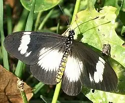 The wingspan is 45–55 mm for males and 53–60 mm for females. Males and females both show the same range of colouration.[2] The dusky acraea is a variable species, but the most common form is black with a white band across the forewing and a white patch on the lower forewing and on the hindwing.[2] There are a number of described morphs (with white, yellow or orange patches) including: