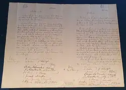 In 2017, Lithuanian businessman Darius Mockus offered a 1-million-Euro reward to anyone who could find the original document and give it to the State of Lithuania. The offer's deadline was set to February 16, 2018, when Lithuania will commemorate the 100th anniversary of its declaration of independence.[24] On March 29, 2017, Vytautas Magnus University professor Liudas Mažylis announced he had found the original document in the Federal Foreign Office Political Archive in Berlin, Germany, hand-written in the Lithuanian language and signed by the twenty.[25] He also announced that he had found the German-language version of the February 16, 1918 document and the Act of December 11, 1917. The latter displays nineteen signatures (without that of Pranas Dovydaitis).[26][27] Germany confirmed the documents' authenticity on the following day and they were displayed publicly by two officials – Michael Roth, the German Minister of State for Europe, and Deividas Matulionis, Lithuania ambassador in Germany.[28][29] On October 7, 2017, Lithuania Minister of Foreign Affairs Linas Linkevičius and Germany Minister of Foreign Affairs Sigmar Gabriel signed an agreement that the original Act of Independence will be displayed for five years in the House of the Signatories where it was originally signed, making it the main symbol of the Lithuania's Centenary of the Restoration of the State celebrations.[30] On December 22, 2017, experts from the Lithuanian Police Forensic Research Center after a thorough analysis announced that the hand-written act was written by one of the signatories Jurgis Šaulys hand.[31][32]