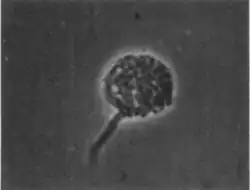 The shape of the sporangia takes on a more regular shape immediately before rupturing. The spores released are highly motile, taking on varying shapes of spherical and oval.