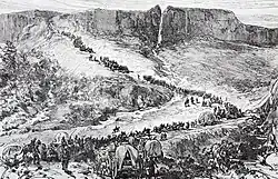 As the British column approached, the Zulu herdsmen drove the livestock deeper into the gorge and raised the alarm. The NNC were in good spirits until they came within gunshot of the "several score" Zulu warriors who were hiding among boulders, shrubs and caves at the edges of the gorge.[34][4] At this point they were challenged by a Zulu shouting "By whose orders do you come to the land of the Zulus?".[4] A newspaper reporter with the British, Charles Norris-Newman, recorded that no reply was made but Hamilton-Browne noted that his interpreter, Lieutenant R. Duncombe, replied "By the orders of the Great White Queen".[4] The Zulus then opened fire on the British right flank, their first shot striking an NNC man and breaking his thigh bone.[4][26]