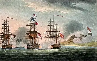 There were no casualties aboard Anson, but Arethusa lost two killed and 32 wounded, with Brisbane among the latter.[1] The captured Pomona was subsequently taken into the Navy as HMS Cuba.[5][6] Charles Brisbane would later take the Dutch island of Curaçao in January 1807, using Anson to achieve that goal.