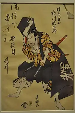 Actor Ichikawa Ebijūrō as Samurai is an ukiyo-e Japanese woodblock print by Osaka-based late Edo period print designer Shunshosai Hokuchō (春曙斎 北頂) (fl. c. 1822-1830). The print depicts a scene from a kabuki play featuring Osaka actor Ichikawa Ebijūrō (市川蝦十郎) in the role of a samurai. One impression of the print belongs to the permanent collection of the Prince Takamado Gallery of Japanese Art in the Royal Ontario Museum, Canada.
