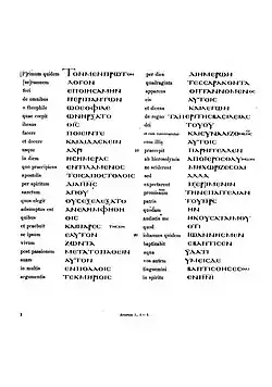 ![]() Tischendorf's facsimile from 1870 of Acts 1:1–5 in Latin (left column) and Greek (right column) in Codex Laudianus, written about AD 550. | |