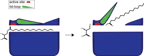 Acyl-protein thioesterases feature 3 major structural components that determine protein function and substrate processing: 1. A conserved, classical catalytic triad to break ester and thioester bonds;[2] 2. A long hydrophobic substrate tunnel to accommodate the palmitoyl moiety, as identified in the crystal structures of human acyl-protein thioesterase 1,[2] human acyl-protein thioesterase 2[13] and Zea mays acyl-protein thioesterase 2;[14] 3. A lid-loop that covers the catalytic site, is highly flexible and is a main factor determining the enzyme's product release rate.[14]