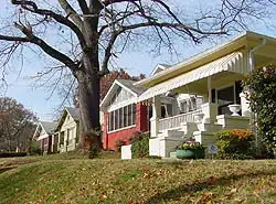 Similar to neighboring West End, the predominant house type within the neighborhood is the bungalow with American Craftsman style detailing. Other architectural styles represented include Folk Victorian, Queen Anne, and English Vernacular Revival. There are also several apartment buildings within the district. Lots are typically 50' x 200' including dedicated driveways and access to rear yards. Landscaping is informal with grass yards, mature trees and shrubs. There are sidewalks, granite curbing, steps from the street to the yards, and retaining walls within the district. The few historic commercial buildings are generally one-story freestanding or attached neighborhood stores. Most are constructed of cinder block or brick and feature storefront windows.