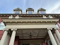 The Leighton House is located in Portland's West End, near the northern end of the Western Promenade, a public park. It is set overlooking the park on the east side, between West and Pine Streets. It is a 2+1⁄2-story brick building, with a dormered hip roof with bracketed eaves. The front facade is three bays wide, with an asymmetrical arrangement. The left bays are in a rectangular projection with single sash windows, and the right bays form a rounded projection with three window bays on each level. The entrance is at the center, sheltered by a portico supported by modified Doric columns. Corners are laid in brick that emulates quoining, and the windows have keystoned lintels.[3]