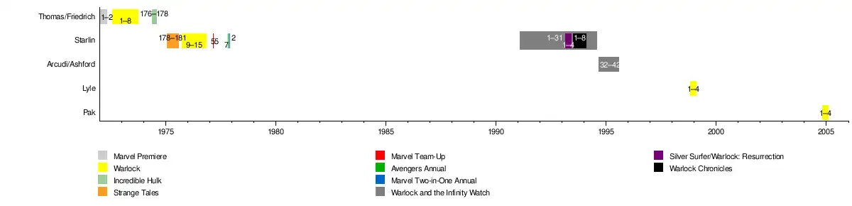 Timeline of comics starring Warlock or wrapping up storylines from his ended series.